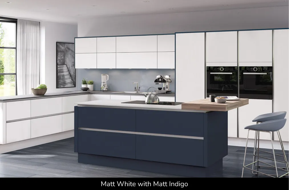 European influence, adapted for UK installation. This linear handleless design is now becoming mainstream within Great Britain. Available in a choice of five gloss colours, three super matt colours and six melamine finishes. Discover modern handleless kitchens with the Avalon Kitchens Moderna range!