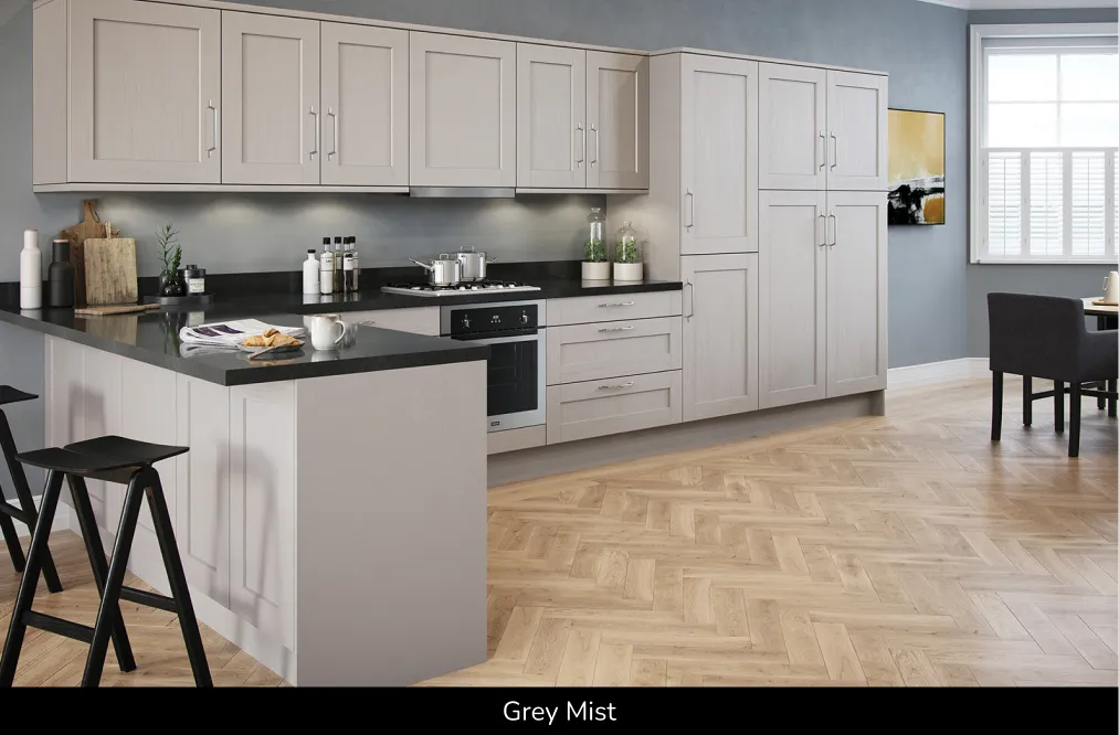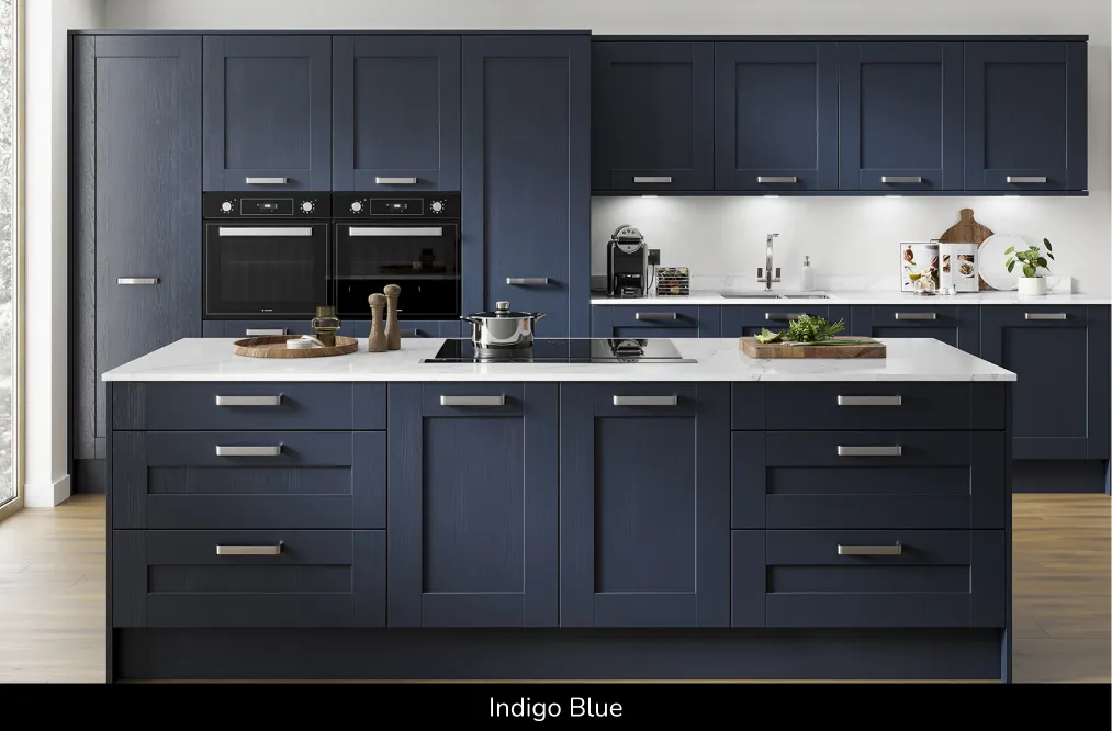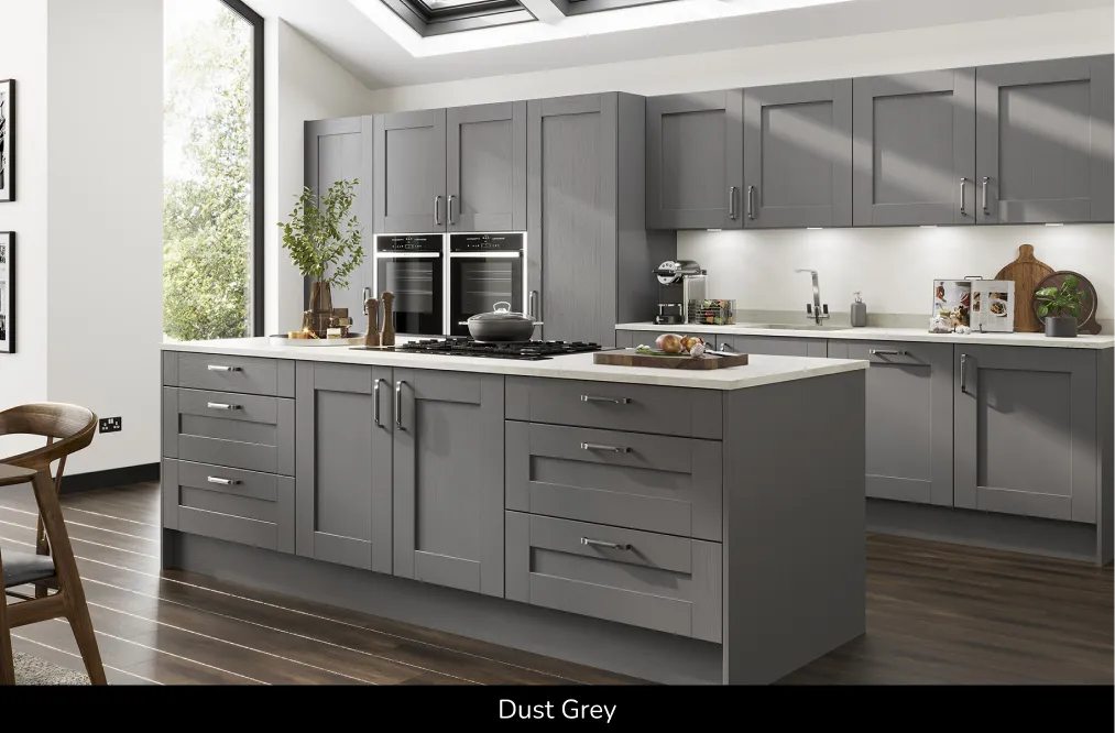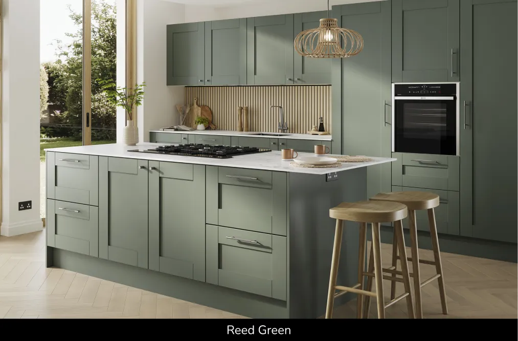 Durable and cost-effective compared to painted timber, available in Reed Green, Grey Mist, Dust Grey and Indigo Blue. Explore this timber style shaker kitchen, shaker kitchens UK and painted timber shaker kitchen doors!